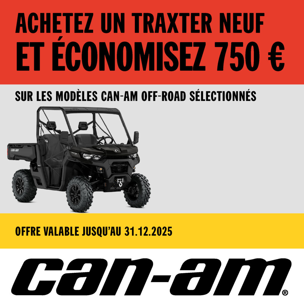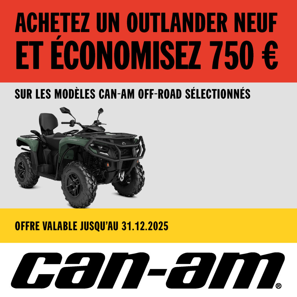 Cette offre est valable sur les nouveaux modèles Can-Am Off-Road sélectionnés, neufs ou inutilisés, enregistrés entre 15.10.2025 et 31.12.2025 par un concessionnaire participant. L’offre est applicable uniquement aux enregistrements pour un usage récréatif et dans la limite des stocks disponibles. La valeur de la remise s’applique au prix de vente conseillé, y compris la TVA. L’offre ne peut être substituée ni convertie en espèces et n’est valable que pour les clients vivant en France et Belgique. Les concessionnaires peuvent vendre à un prix différent. Pour des informations précises et complètes sur les prix des véhicules, veuillez contacter votre concessionnaire local. L’offre est sujette à résiliation ou à modification à tout moment sans préavis.